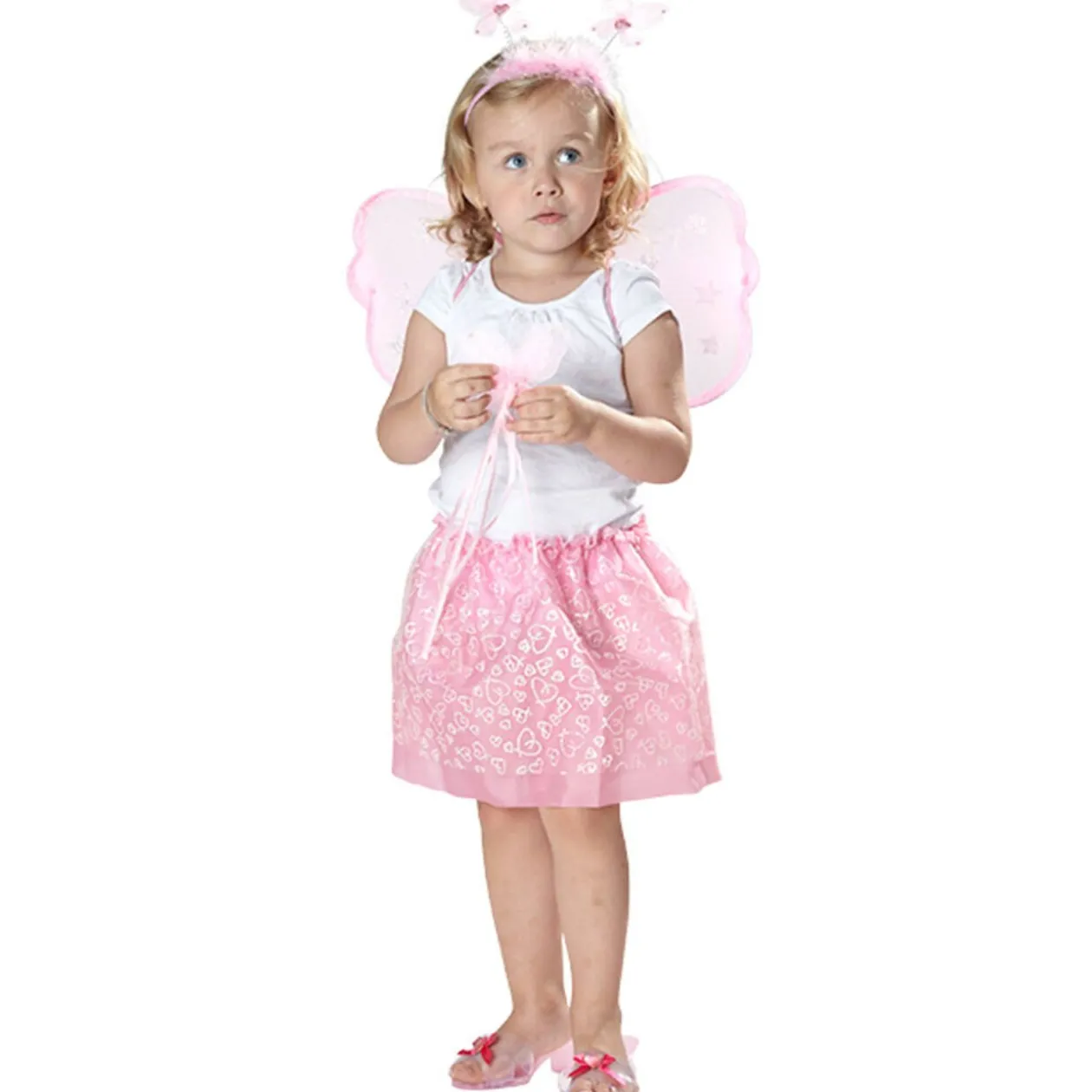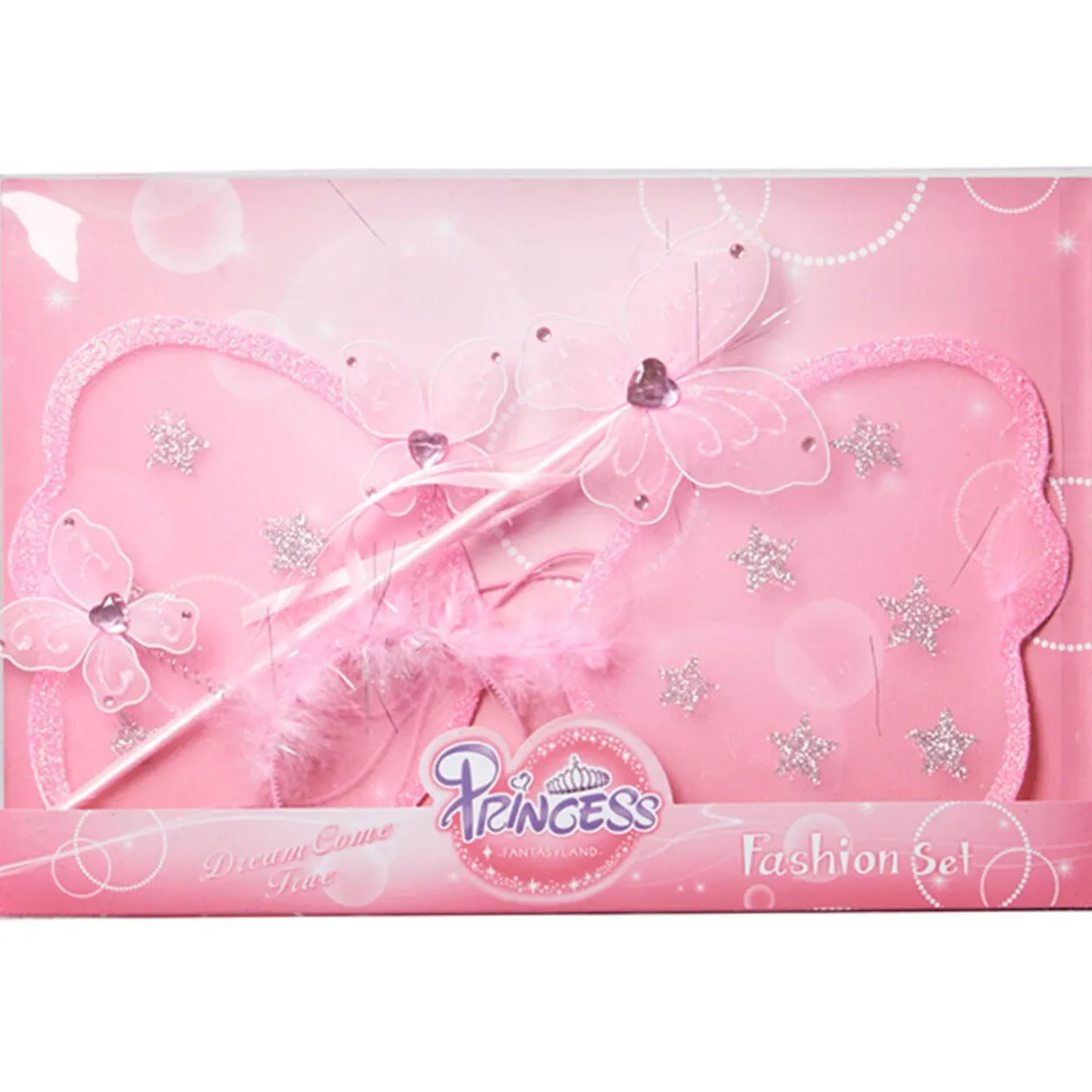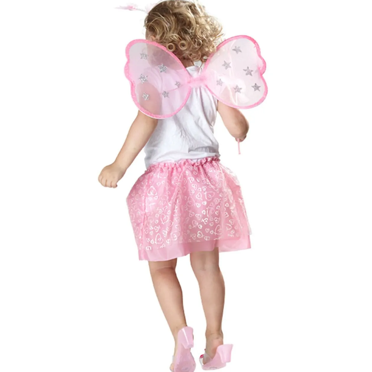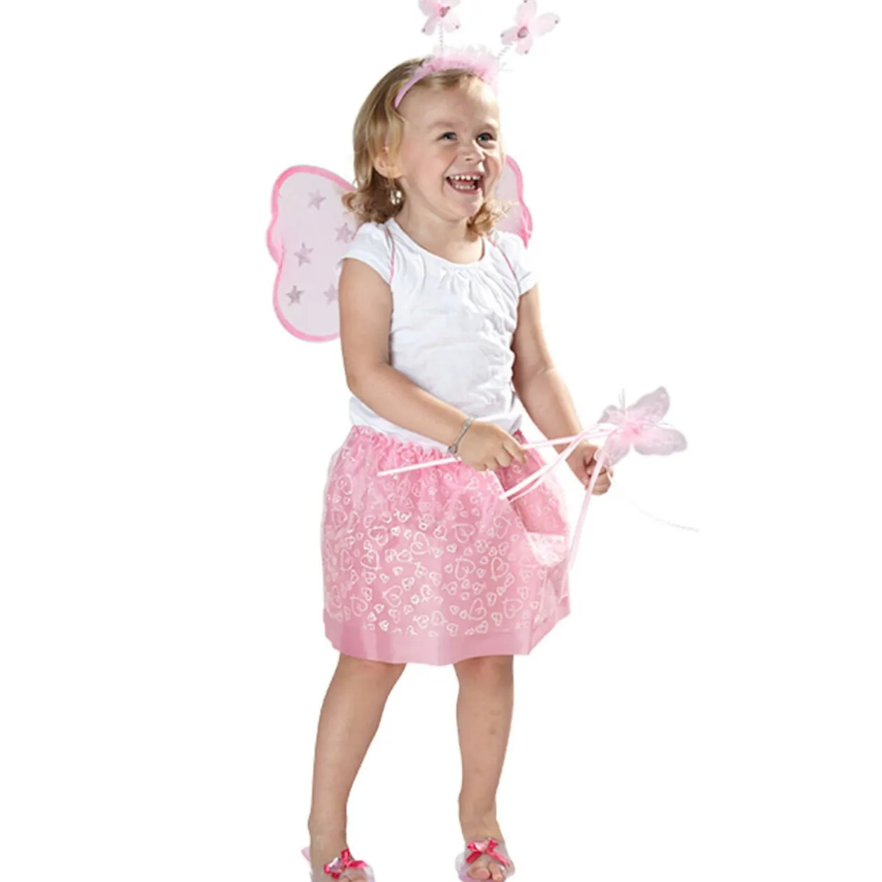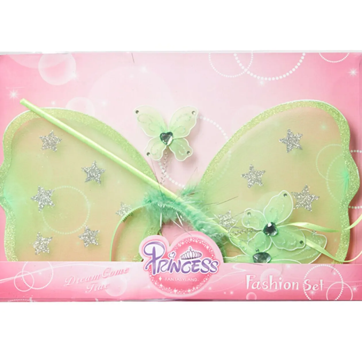 Panoplie de fée rose ou verte comprenant : des ailes de fée, une baguette et un diadème.