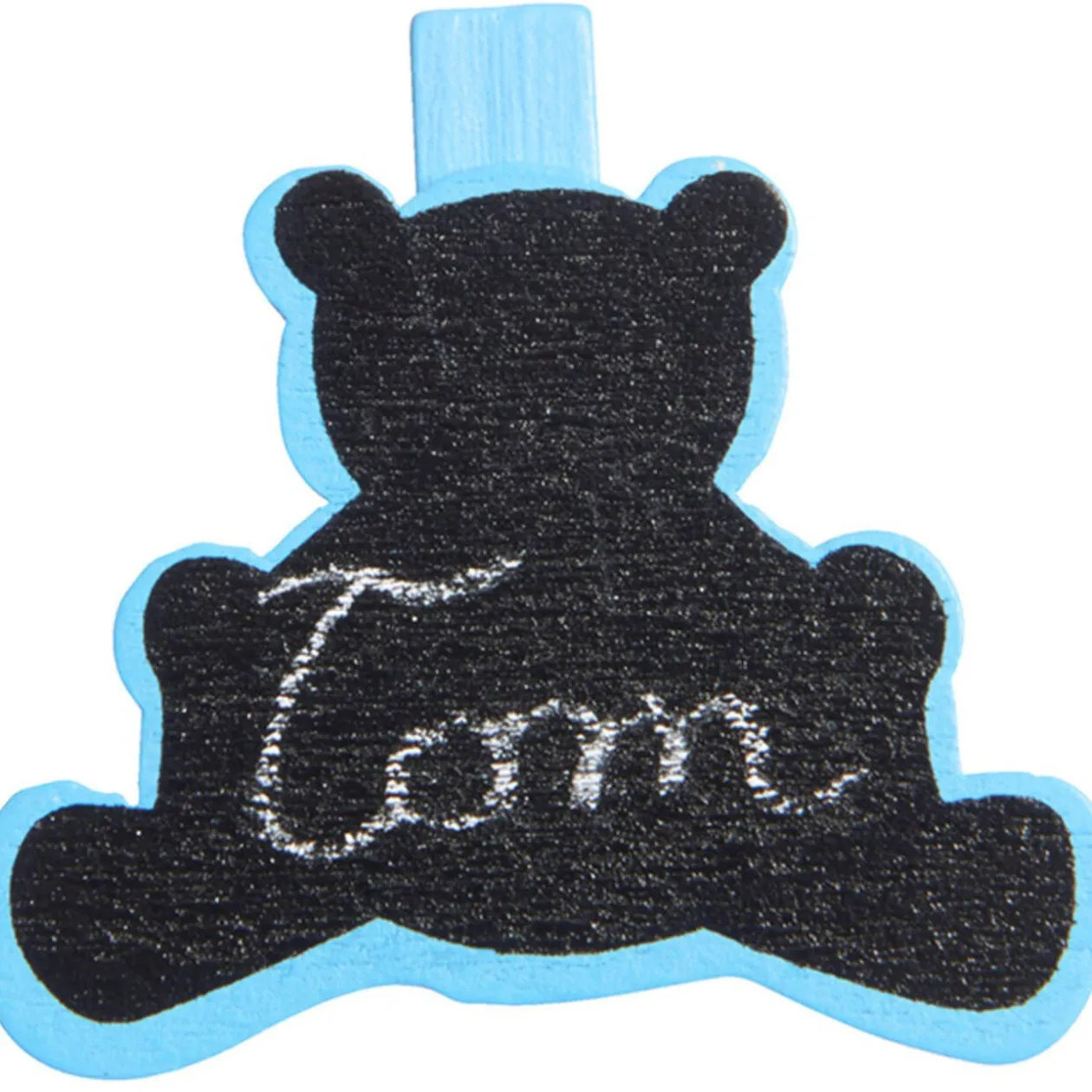 6 pinces ardoise en forme d’ourson bleu, dim. 3×4 cm. Peut s’utiliser en décoration de table ou marque-place pour baptême ou autre évènement.