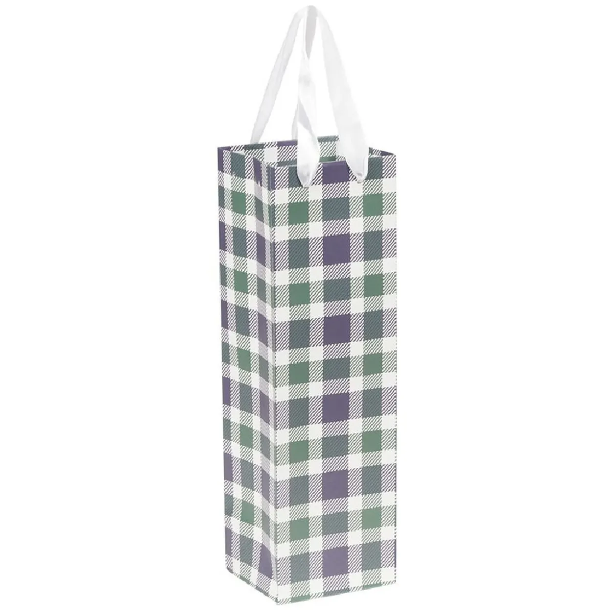 Sac à bouteille de Noël de différents modèles, l’un rouge avec points dorés, l’autre tartan vert et blanc motif renne, et le dernier rouge motif doré avec soldat Casse-Noisette.