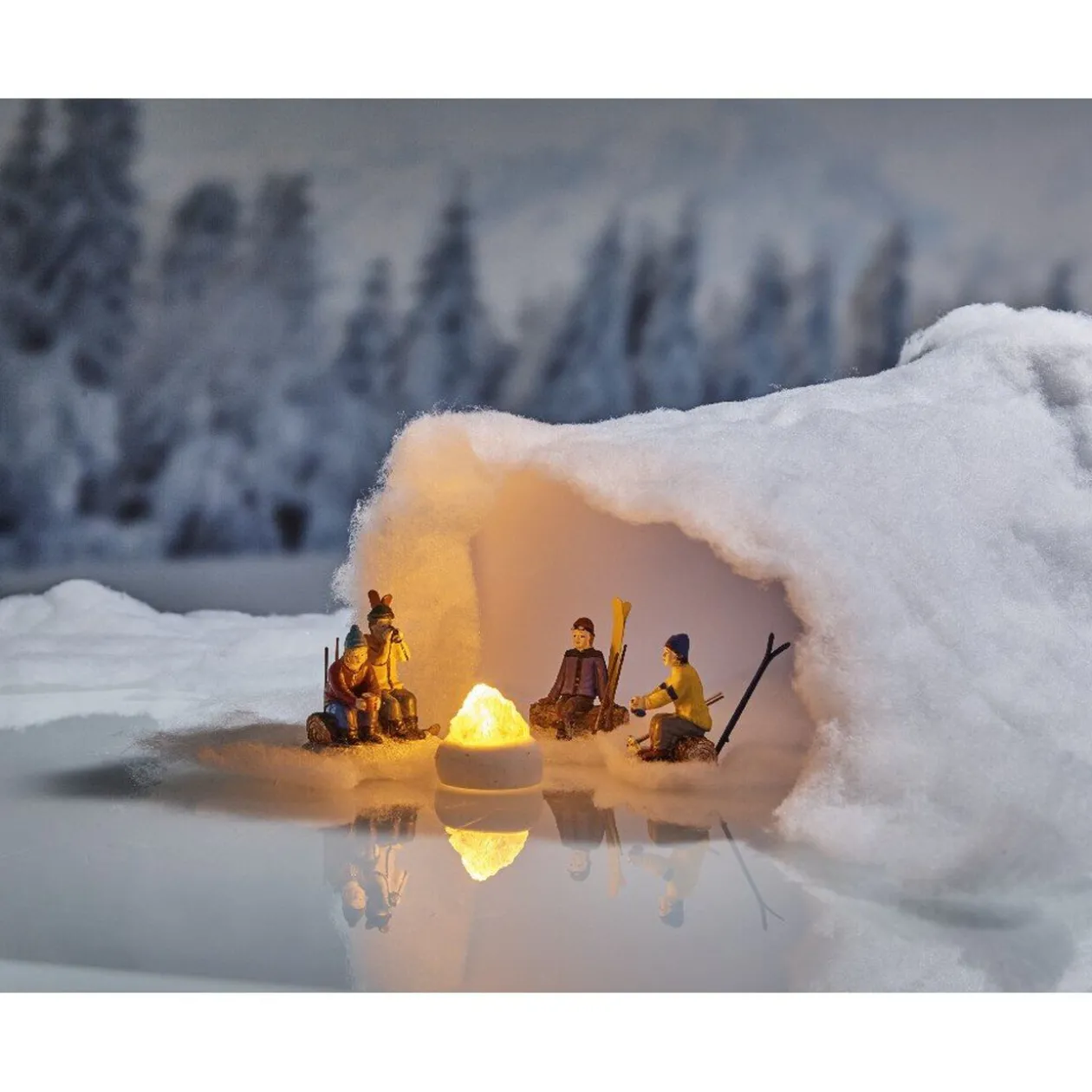 Cette scène avec personnages au coin du feu s’illumine grâce à 1 led blanche.