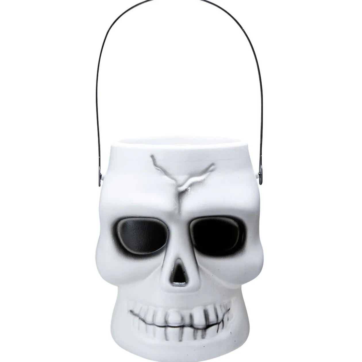 Seau en plastique forme et design tête de mort de couleur blanche et noire avec anse.