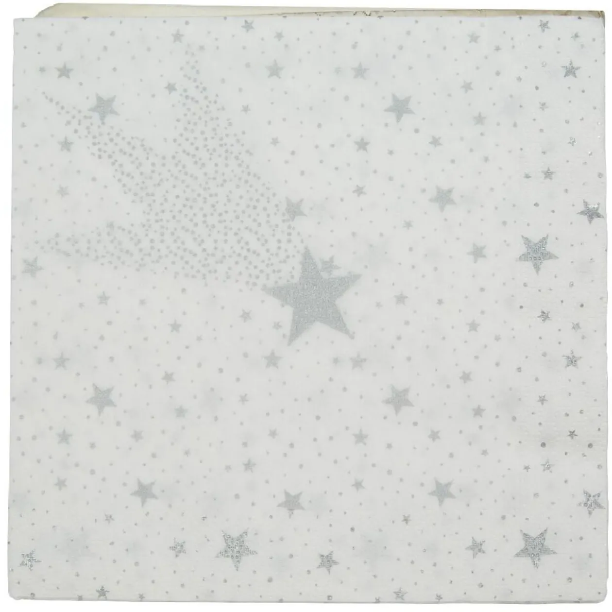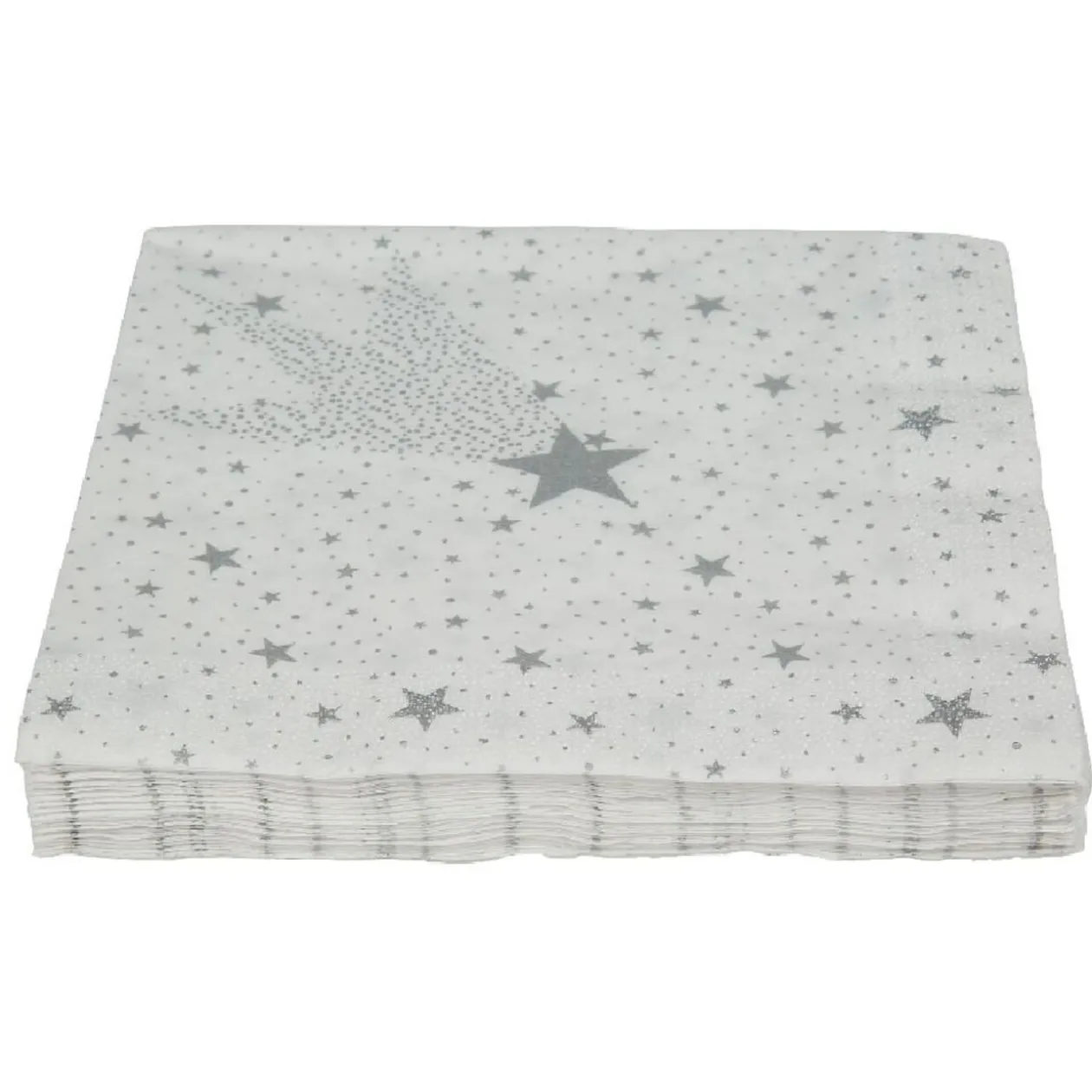 Lot de 20 serviettes en papier blanc à motif étoile argenté, idéal pour agrémenter votre table d’une touche festive.