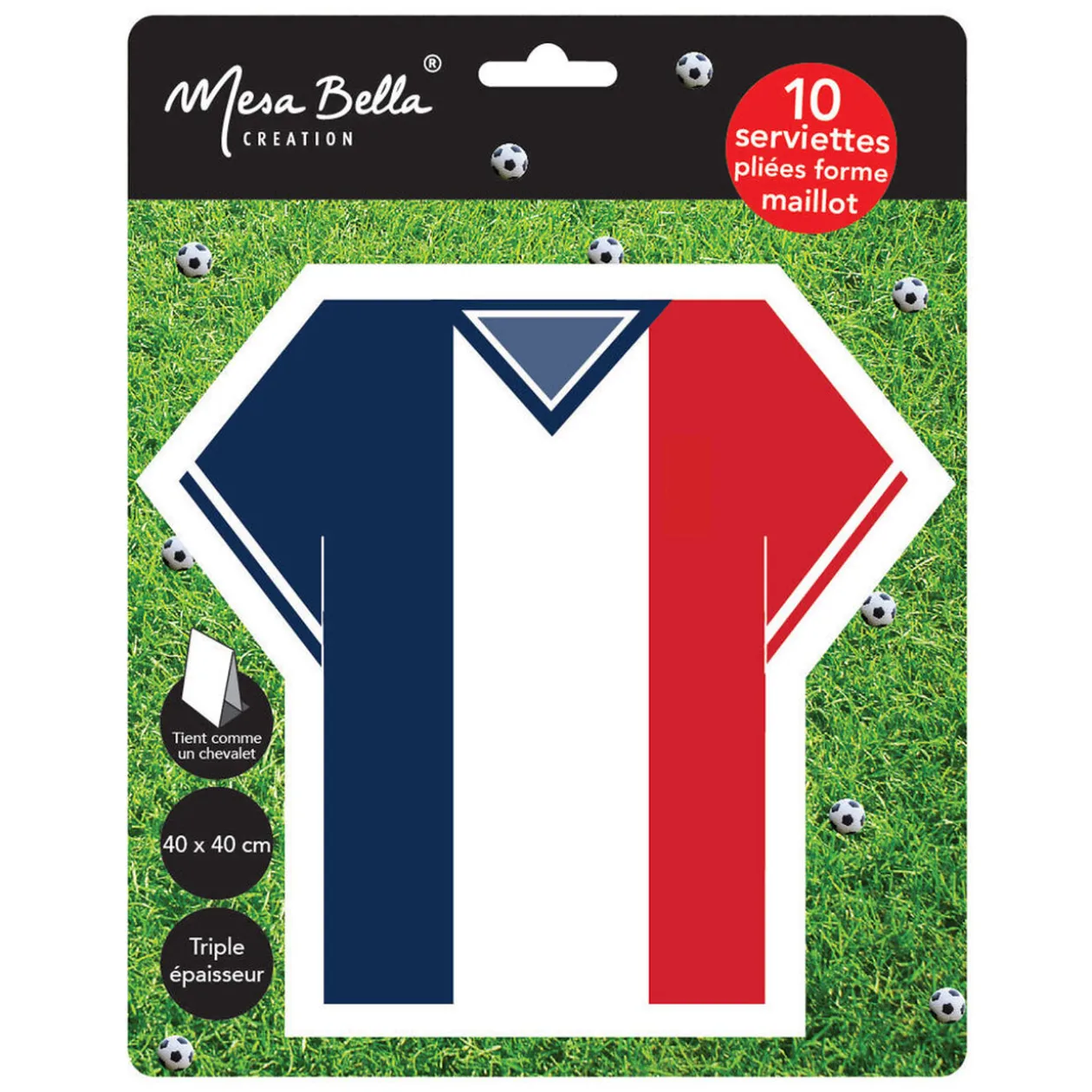 10 serviettes en papier pré-pliées en forme de maillot de football, dim. 14,5xh.15,5 cm, 3 épaisseurs.