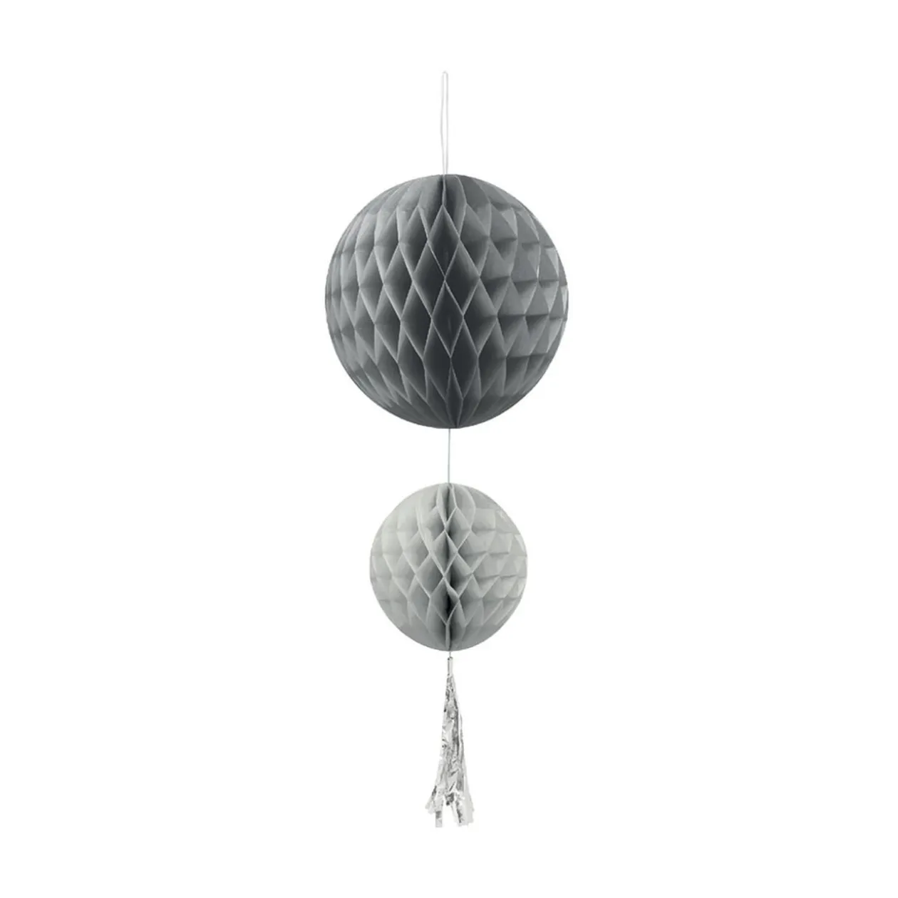 Suspension composée de 2 boules de tailles différentes en papier gris avec finition pompon .