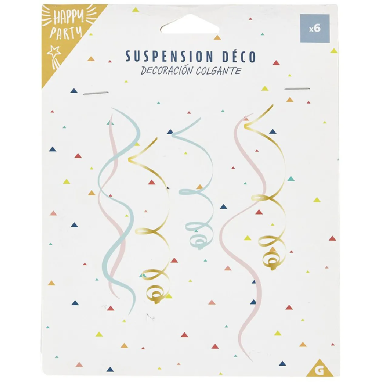 Suspension à spirales en papier de couleur rose, vert et doré.