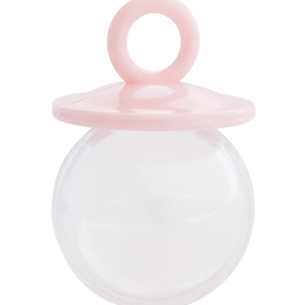 3 tétines à dragées roses, dim. 4,5×7 cm, plastique. Contenant à dragées idéal pour votre baptême ou autre évènement. Vendu sans dragées.